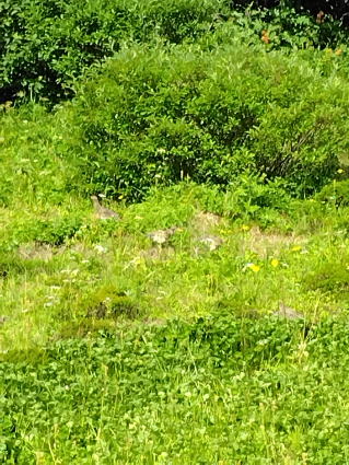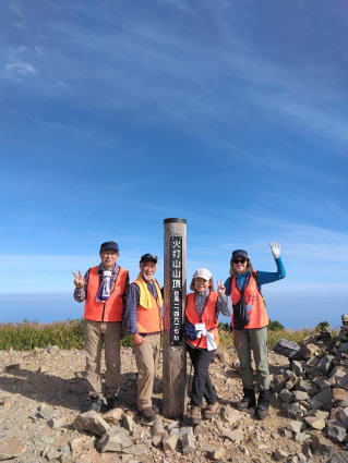 朝から晴れの良い天気でした。早めに出発し、山頂直下で環境省の方の案内で雷鳥観察も行われました。涼しい朝のうちはハイマツから出ていて、ライ鳥を発見しやすいとのこと。家族連れと思われる8羽のライ鳥が確認されました。その後、山頂へ移動しました。天気が良かったことから、頂上からは北アルプスの白馬連峰が望めました。