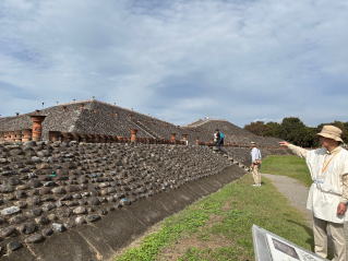 足を踏み入れたのは、1500年前の姿を忠実に再現した八幡塚古墳。ガイドさんの解説に耳を傾けながら見学すると、その完成度の高さに驚かされます。あたり一面に広がる6,000基もの埴輪の群れは、まさに圧巻の一言です。円筒埴輪が古墳の形を際立たせ、その間には、笑っているような人物埴輪や、力強い動物埴輪が生き生きと配置されています。まるで古代の人々が今そこにいるかのよう。特に、後円部に安置された王の舟形石棺は、当時の王の威厳を静かに物語っていました。