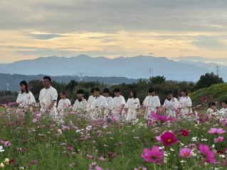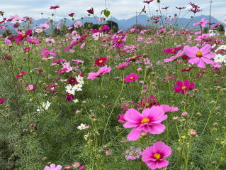 次に足を運んだのは、30万本ものコスモスに彩られるという二子山古墳です。今年は猛暑の影響で花の数は例年の半分ほどとのことでしたが、それでも秋風に揺れるコスモスは美しく、古墳とのコントラストが印象的でした。持参したおにぎりと、温かいすいとんと味噌こんにゃくで、心もお腹も満たされる至福の昼食。自然の中でいただく食事は、格別な味わいです。