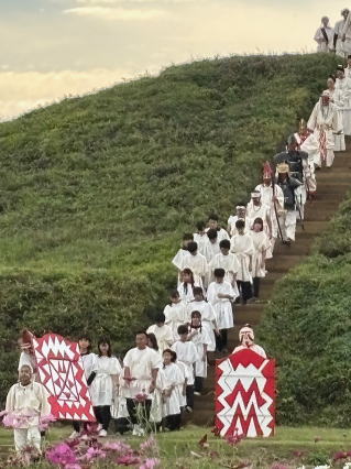 午後の部は、この祭りのハイライトである「王の儀式」から始まりました。コスモスの絨毯が広がる中、太鼓の音が響き渡ると、二子山古墳の頂から古代の衣装をまとった王様の隊列がゆっくりと下りてきます。その威厳ある姿は、まさに時代絵巻そのもの。