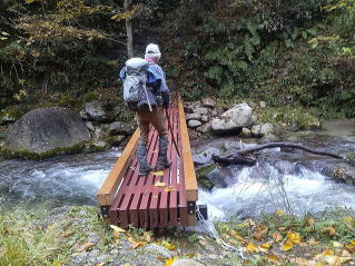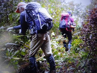 14年前30キロ近くの重い標柱をこのへ吊り道を運びました。小さな沢を渡りますがくるぶし位迄水に漬かりましたが靴には水は入りませんでした。登山道は沢沿いから離れ急登の始まりです。熊に会っても困るので熊除けに今日は鈴、ホイッスル、携帯ラジオの音量を上げてそれと100円ショップで買った弾は出ず音だけの8連発の火薬銃と弾を200発持参しました。