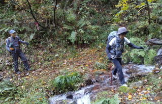 3度歩いている魚止ノ滝から赤安山登山口迄の周回コース、登山口の橋が増水で流されて通行止めになってから3年が経ち今年の4月に新しい橋が出来通行出来る様になりましたが3年の間に登山道は藪化してしまい一般の人は通行できません。そこで五頭山を愛する人が個人的のボランティア活動で五頭山から松平山迄登山道の刈り払いを8月から仕事のお休みの日に始め仲間の手助けも有り9月の下旬に5回目で松平山迄刈り払いが終わったそうです。
