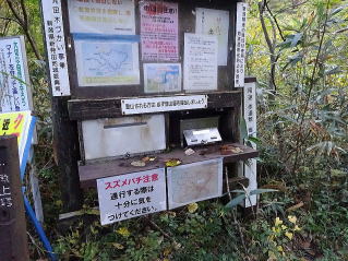 3週間前オオスズメバチの襲撃を受けた場所は土に穴が有り此処に巣が有るのでしょう4匹くらいのオオスズメハチが居ましたが気温が低くなったので動きは鈍いですが近くまで寄ることは危険なので遠くからの写真でよく写っていません。平らな所に有る傾いた赤安山の標柱の前を通り此処から登山口迄は檄下りも有り疲れた足には辛いです。