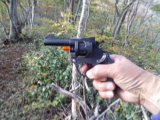 急登のブナ林で休憩、誰も居ないので8連発のピストルをパンパンと撃ちまくり疲れもストレスも解消しました。