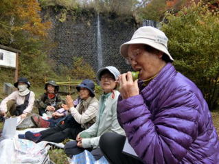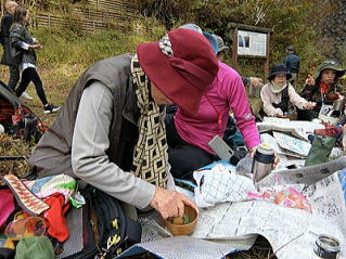リーダーが「ここで野点をしましょう」。持って来た抹茶と道具を広げ仲間達の手伝いを受けて点てる。皆さんが喜んで飲んでくださる。一回飲み終えた後、