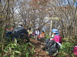 登山口から1時間半程で狭い掃部ヶ岳山頂に到着しましたが満席で座り込むスペースは有りません。
