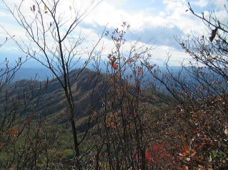 暫く下ると目の前にもう一つ激しく尖ったピークが見えて来ました、「アレも越えるか、勘弁して 、 、 」と計画書を確認して一安心、ピークを左に避け林道に向かって下りました。