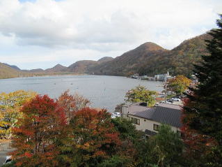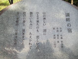 三連休のモミジ狩りで賑わう湖畔の宿公園をスタート、メンバーはほとんどが高峰三枝子を知っている年代です。
