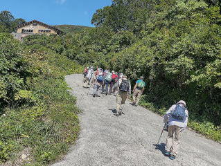 きょうは、最高の登山日和です。50人の大行列、他の登山者に迷惑とならないよう、みんなで「登山者が行きまーす。右側(又は左側)に寄ってー」と大きな声を出しました。