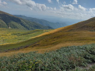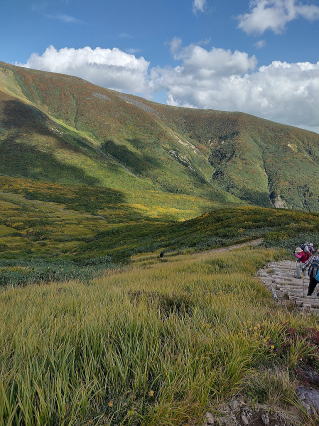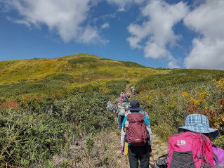 頂上の看板の前で集合写真を撮り、草紅葉の見える所へ下り、又戻り、山頂駅を目指して下山しました。紅葉している月山、遠くに山並み、月山湖(ダム湖)と寒河江川が見えました。途中、赤ちゃんと2人の子供を連れた若い夫婦や若者等、軽く会話を交わせた事は山登りならではの楽しいひと時でした。 |