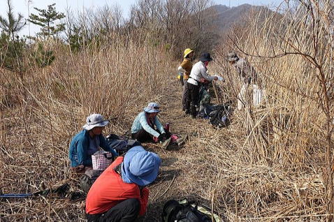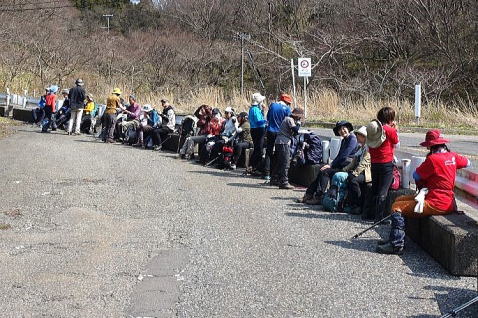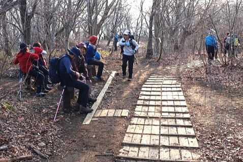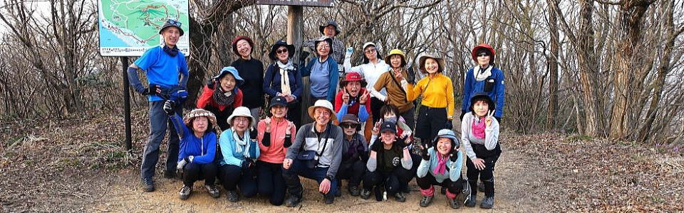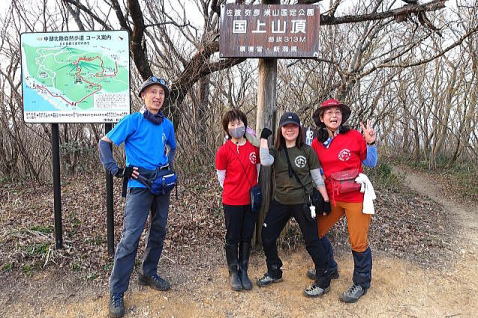 カタクリを堪能した後、最後の国上山に向かいます。17:05、ようやく国上山山頂に到着、ここまで12時間と15分、頑張って歩きました。とても疲れましたが、皆さん笑顔で、歩き通した満足感もいっぱいです。 |