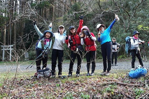 にぎやかだったおしゃべりも、登りがきつくなると静かになります。そんな時は要注意です。12:10、多宝山山頂に到着、30分ほどの短めのお昼です。風も少し有って、体が冷えないように1枚着込みました。お昼の後は、集合写真です。まだまだ、皆さん元気一杯です。