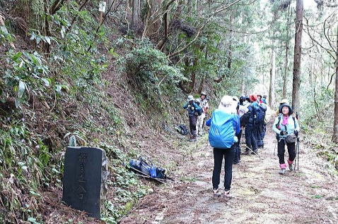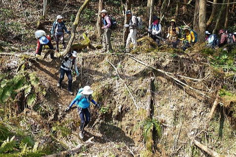 搦手道入口から黒滝城址まで、標高差で200m程の急登が続きます。時間にしたら30分ほどの登りですが、途中から沢沿いの泥んこの急登で、昨年この登りを、“とどめを刺されたような登り”と評した会友がいましたが、まさにその通りです。10時間歩いた後の泥んこの急登は、心身に応えました。 |