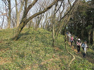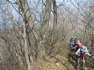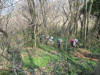 帰りの桜尾根の斜面にはカタクリの群落が続いている。分岐から此ノ入りコースに入り急な道を慎重に降りる。