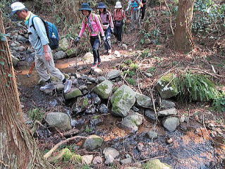 妙光寺の墓地がきょうの登山口である。細い流れを越え急傾斜の登山道となる。