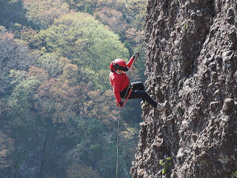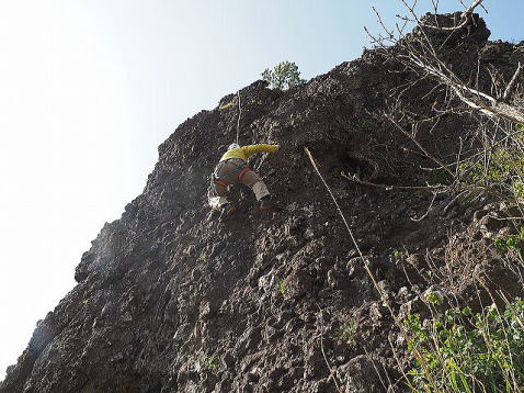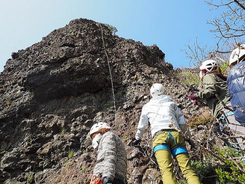 午後から風がかなり強くなって来たので垂壁の懸垂下降だけで終ろうかと思いましたが、皆さんやる気満々で強風の中ほぼ全員が垂壁15m登りを体験しました。