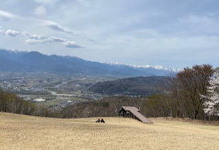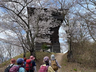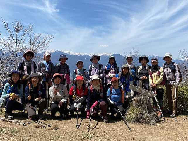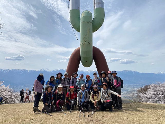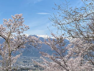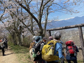 桜のアーケードのような登山道と木々の間から見える残雪の北アルプスの絶景を楽しみながら登りました。光城山山頂ではなんと!常念岳の鞍部に槍ヶ岳の穂先まで見ることができ、北アルプスの峰々を眺めながらゆったりと昼食を食べました。