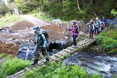 10分程歩いて、案内板広場に到着。沢には橋が架かっていて、濡れているときは滑って沢に落ちる危険があり、今日の行程で一番の難所?かも知れません。重機が入って林道工事の真っ最中。危険な橋を渡るのは、もう少しの辛抱の様です。 |