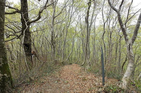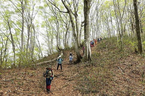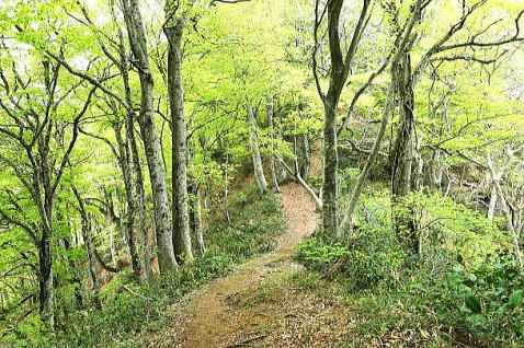 二合目を過ぎてブナ林に入ると、緑のトンネルの中を歩きます。新緑の緑がとてもきれいです。初めは濃かった緑が、登るに従って薄くなって、透明感を増してゆきます。 |