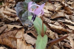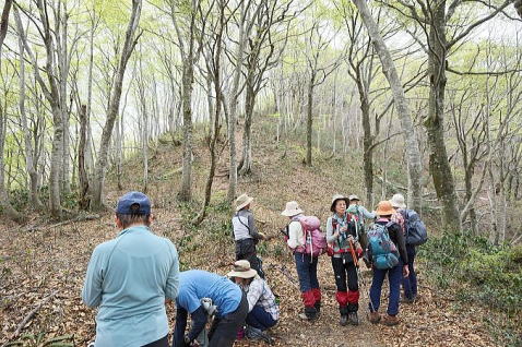 13:10、大蔵山到着。山頂からの展望をもう一度楽しんだ後、下山開始です。稜線では芽吹きが始まったばかりの淡い緑が、下るに従って少しずつ濃くなるのが判ります。 |