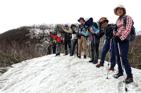 菅名岳山頂で集合写真を撮った後、12:00、大蔵山に向けて歩いてきた稜線を戻ります。残雪の稜線歩きをたっぷりと楽しんでほしいと思い、この会山行では、周回はせずに大蔵山に戻る事にしています。 |