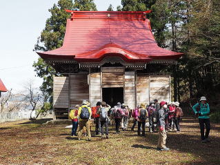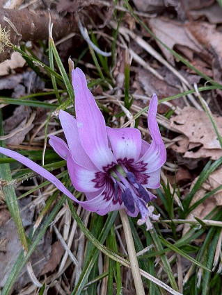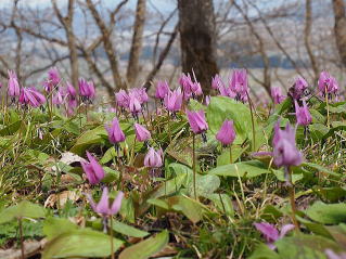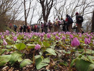 登山口から少し登ると神社があり、みんなで安全登山を願います。そこからもうお花だらけ、すぐにコシノコバイモが現れ、写真タイムでなかなか前へ進みません。カタクリのピンクの絨毯もずっと続きます。